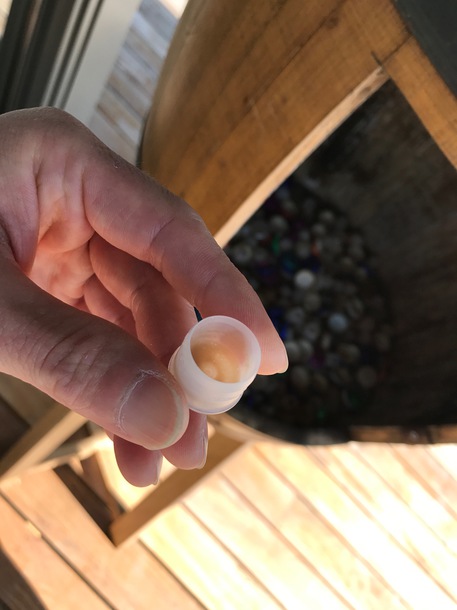 開けた王冠の裏についていたキャップを見せてくれました。なるほど中にドロッとした折がくっついている。そしてくりぬいた樽の内側にも飛び散った澱が付着していました。